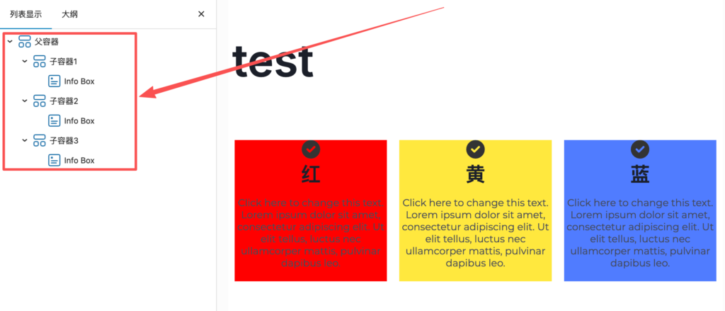 上图的布局效果,就是用Container来实现的。具体逻辑是在Container容器里面,装了三个Container容器,然后在每个容器里面装了一个info box板块。如下图所示: