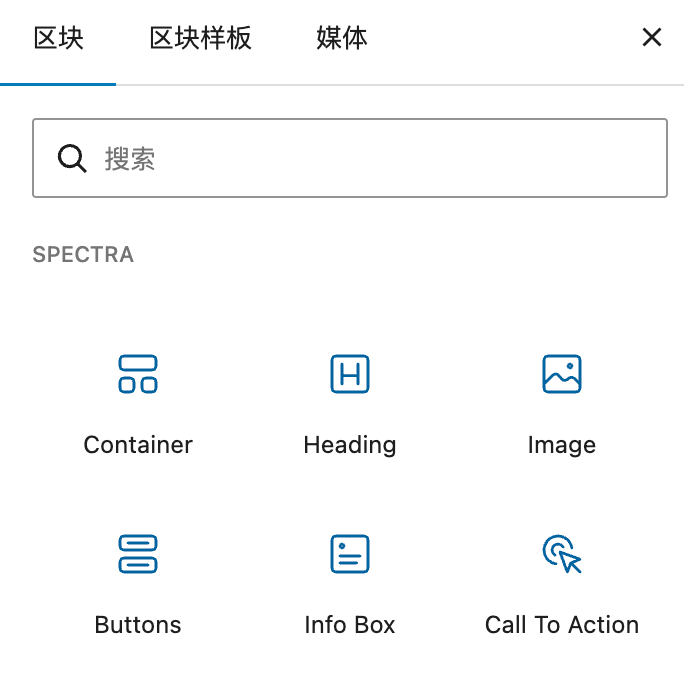 基于Astra主题的WordPress页面设计是非常简单的,任何人都能快速学会。设计页面的整个操作过程类似于搭积木,我们只要把相应的模块(图片、按钮、文本等)放到页面上,调整其位置、大小、颜色等参数,就能快速设计出一个漂亮的页面了。正是因为这个原因,我们通常把建网站叫做“搭建网站”。下图是用来搭建页面的“模块库”,正是名字叫:区块。