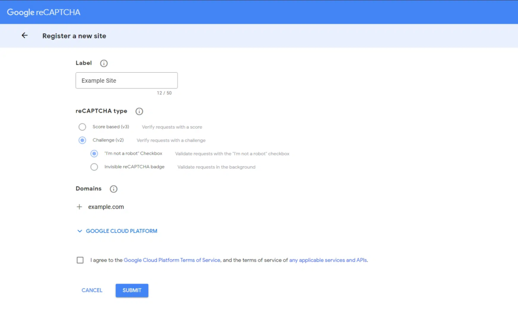 接下来,您需要输入标签、reCAPTCHA 类型和您的域名。