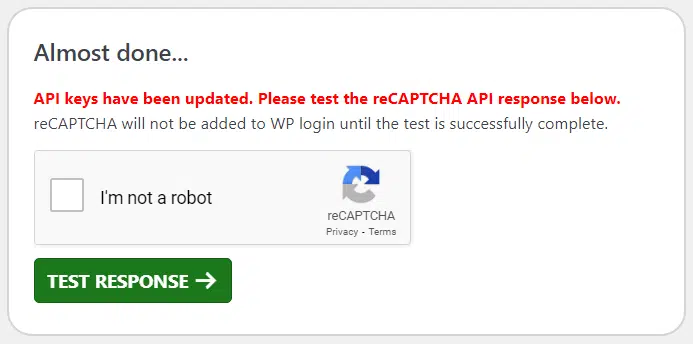 最后,首次设置或更新“站点密钥”或“私钥”时,您需要测试 API 响应,以确保一切正常。只需完成 reCAPTCHA 验证,然后点击“测试响应”即可。