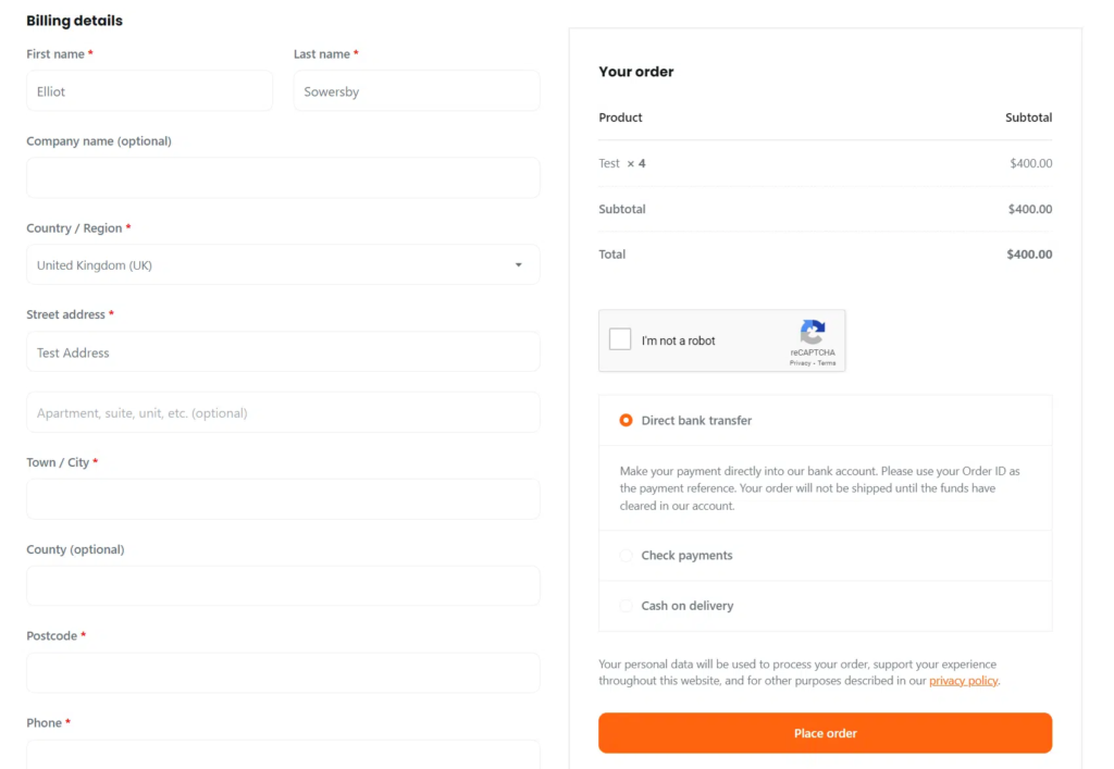 以下是启用 WooCommerce 结账页面后 reCAPTCHA 验证码的示例: