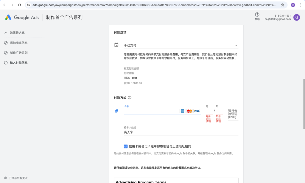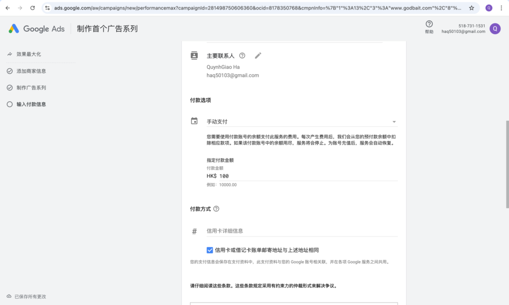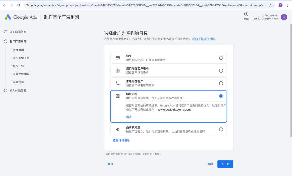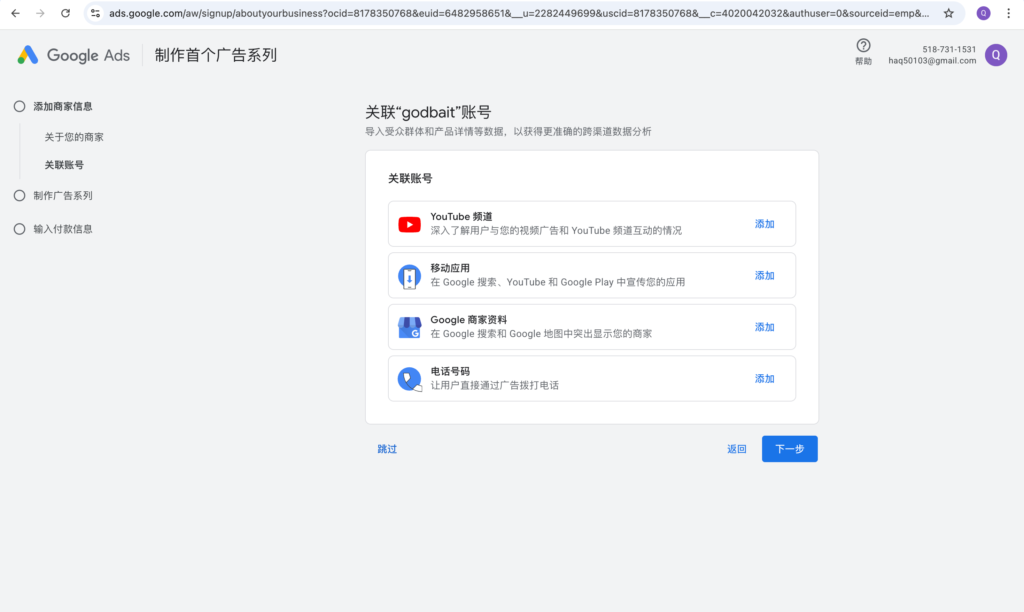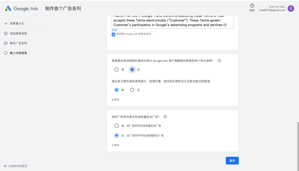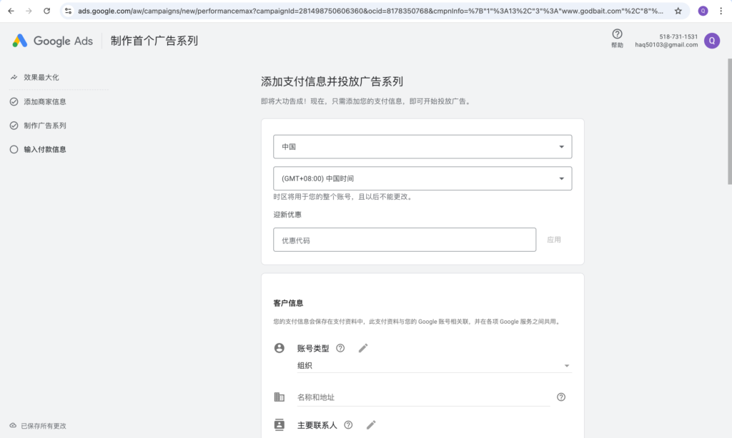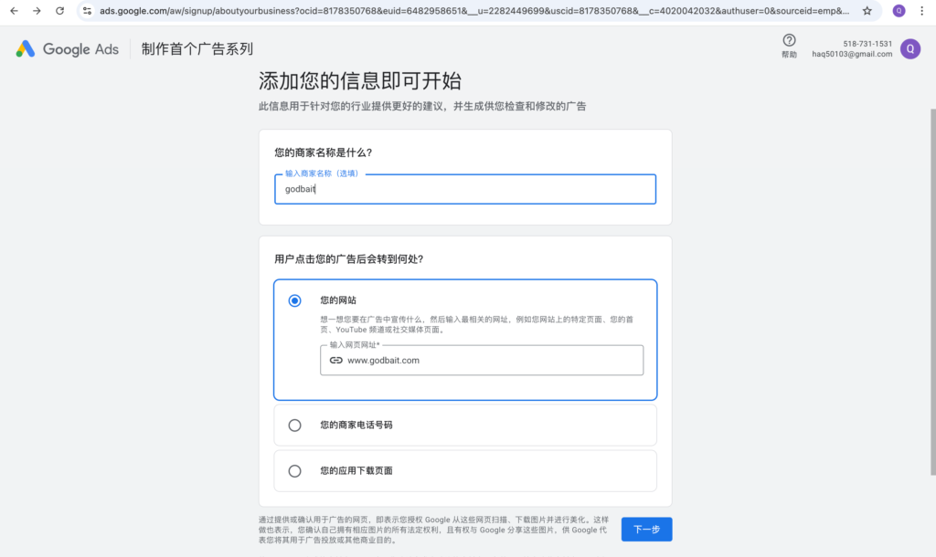 点击“Start now”,进入创建谷歌推广账号流程,如下图: