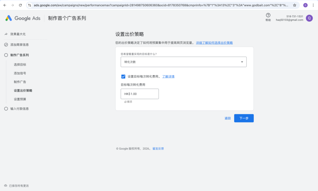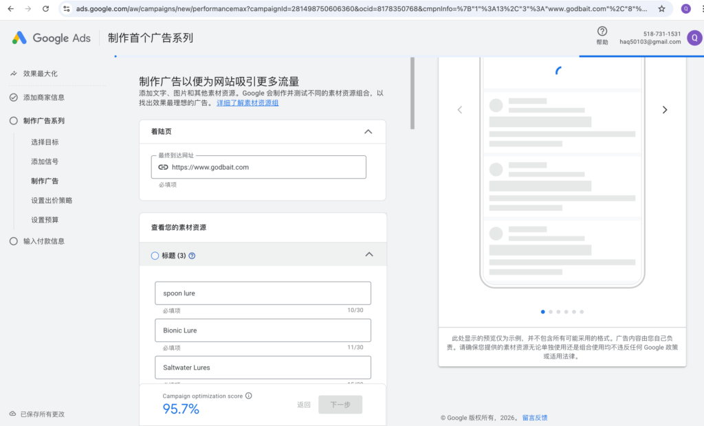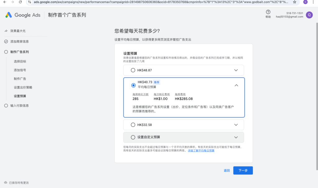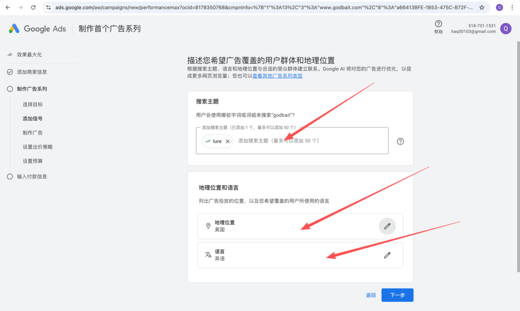 如上图所示,1,设置关键词;2,设置广告投放地区;3,设置语言。然后下一步
