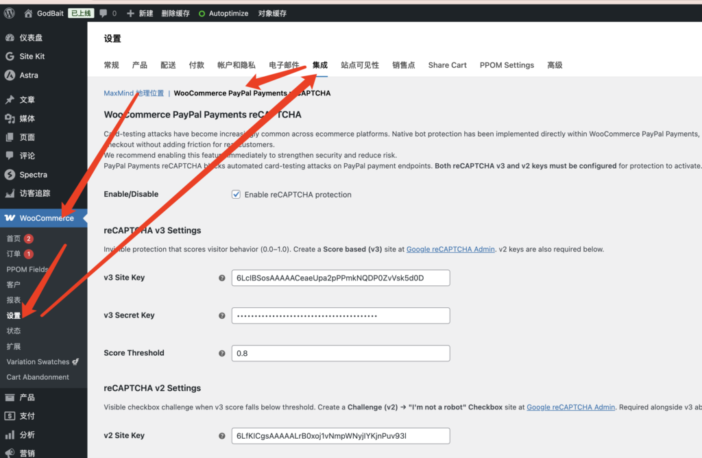在网站后台点击左边导航中的“WooCommerce”,点击展开的“设置”,点击选项卡中的“集成”,再点击“WooCommerce PayPal Payments reCAPTCHA”,如下图所示: