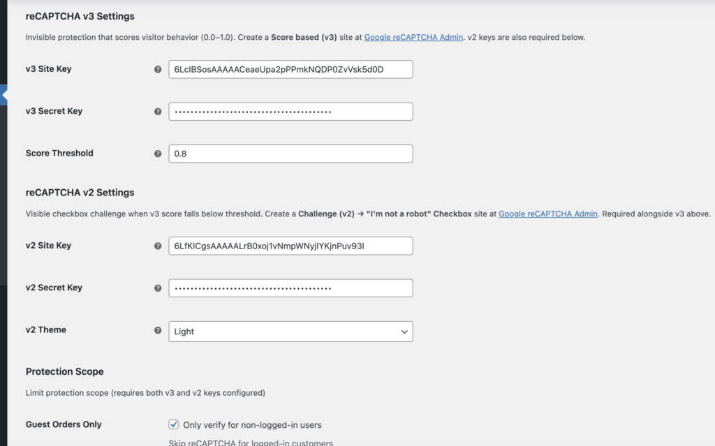 观察表单发现,v2和v3都需要获取。我们可以通过前一篇文章《如何将 Google reCAPTCHA 添加到 WooCommerce》提到的方式,分别获取v2和v3,然后填入上面的表单即可。文章《如何将 Google reCAPTCHA 添加到 WooCommerce》只教获取v2的方式,但是v3也大同小异,操作过程中选择v3即可。