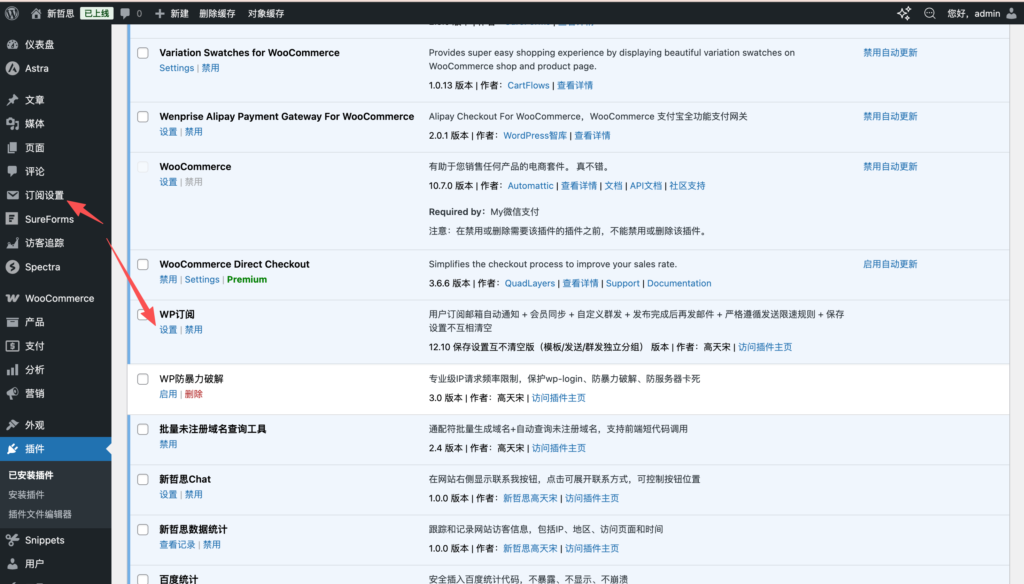 成功安装并激活后,打开网站后台“已安装插件”列表,有两个入口可以进入插件设置界面,具体如下图所示: