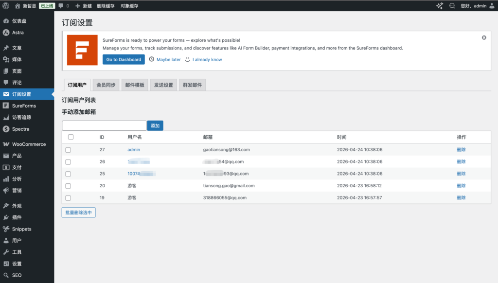 上面有四个选项卡,默认是打开“订阅用户”。在订阅用户界面:可以添加“手动添加邮箱”,什么意思?当你手动添加某个邮箱地址后,你网站更新或者群发邮件,这个邮箱就会收到消息。其次是可以查看订阅邮箱,可以删除订阅邮箱。