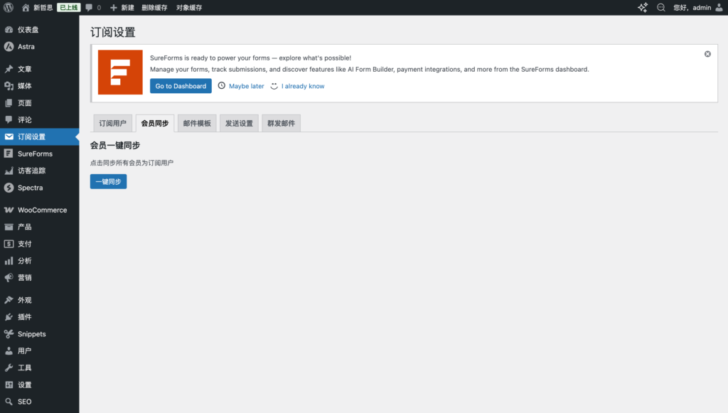 会员同步:默认情况下,会员会直接成为订阅用户。但是如果我们在“订阅用户”列表删除了某个会员后,可以在这里同步一下,再次把会员变成订阅用户。