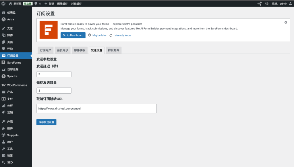 发送设置:通过设置发送延迟及每秒发送数量,提升发送成功率。设置“取消订阅跳转URL”,别人取消订阅的时候,把他送到一个特定的页面,可以进行人文关怀,可以问他为什么要取消订阅。