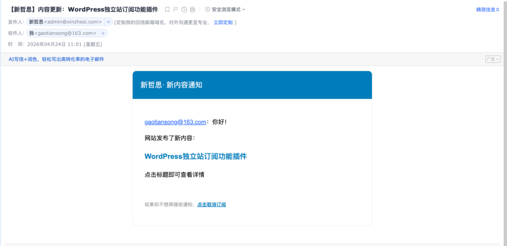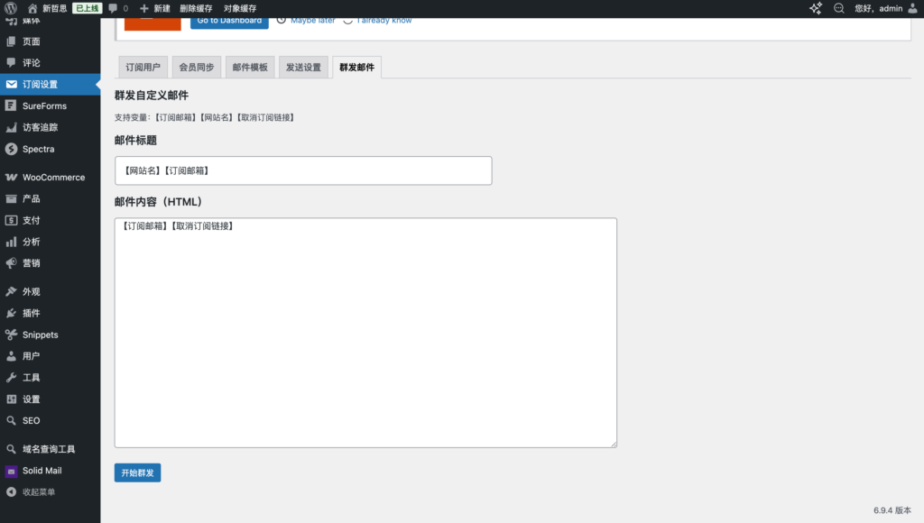 群发邮件:可以设置群发邮件内容,支持变量:【订阅邮箱】【网站名】【取消订阅链接】。变量是什么意思,以【订阅邮箱】为例,在邮件中使用了【订阅邮箱】这个变量,那么客户收到邮件的时候,会发现【订阅邮箱】刚好变成了自己的邮箱地址。在邮件中使用【取消订阅链接】,客户收到的邮件就会有一个取消订阅的按钮,客户点击按钮即可完成取消订阅。