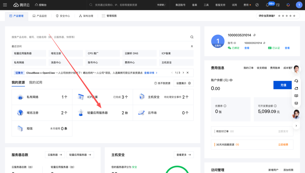 在“我的资源”中,点击“轻量应用服务器”