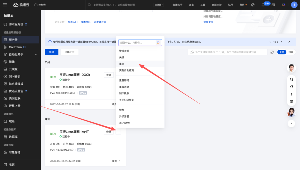 找到你要重启的服务器,点击旁边的“…”,再弹出的界面中,选择“重启”
